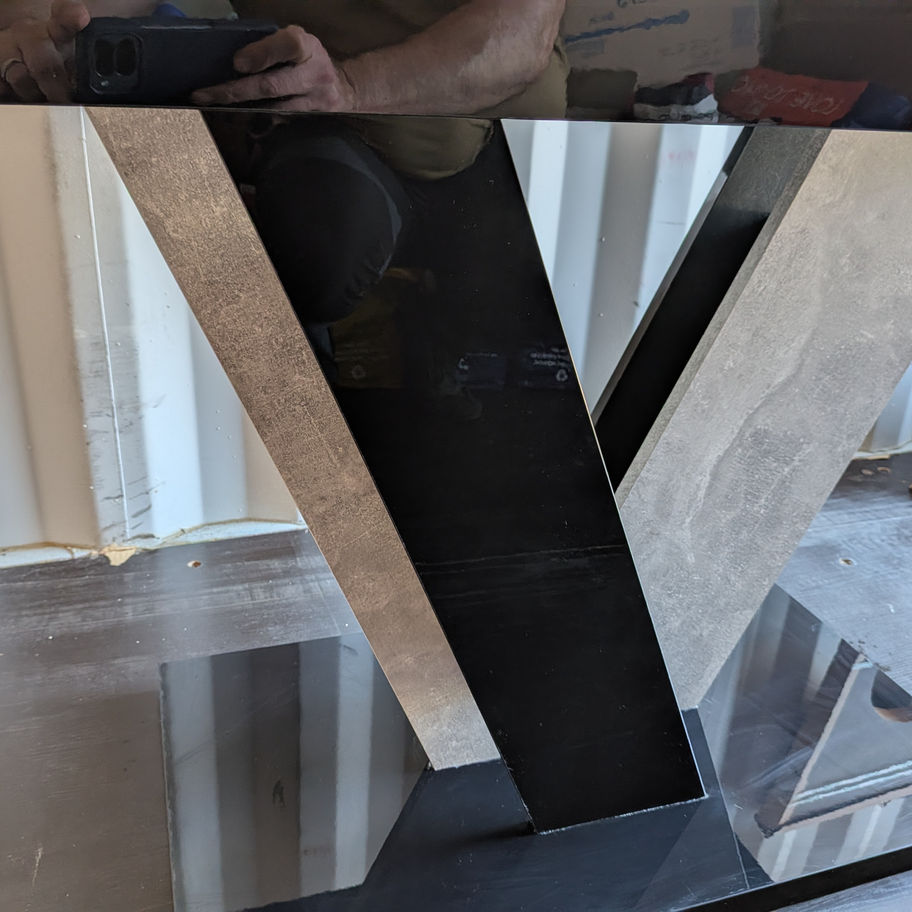 The standout geometric pedestal base not only adds a striking visual feature but also provides excellent stability and legroom, making it as functional as it is stylish. The smooth, reflective surface enhances light in the room, creating a clean and sophisticated feel.